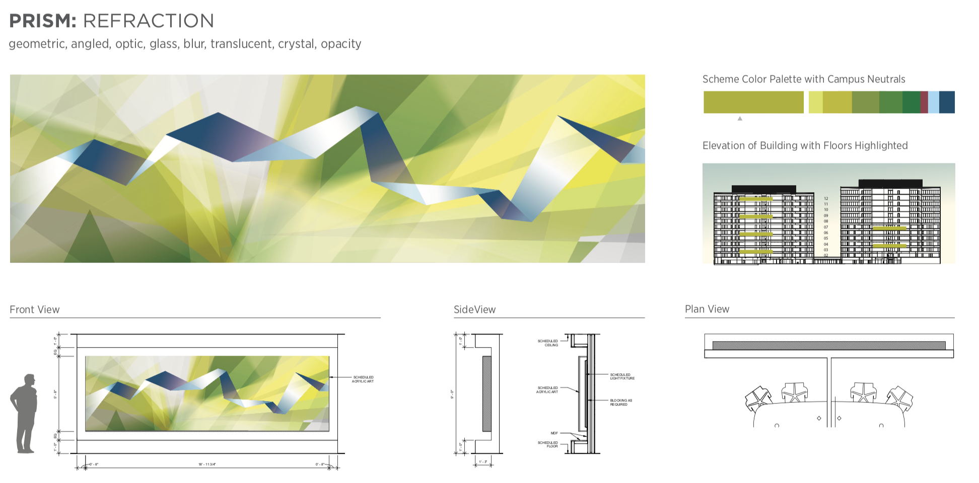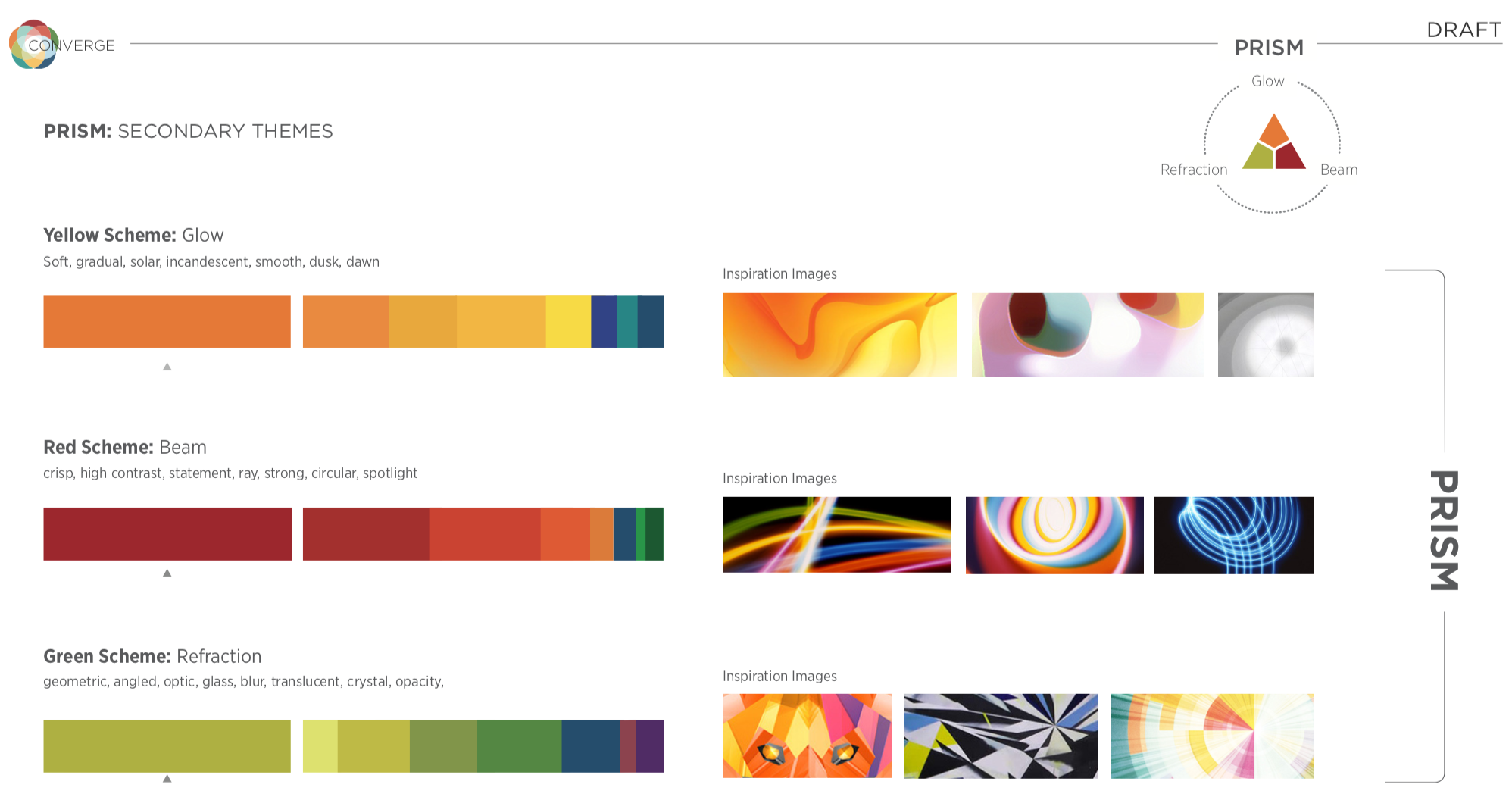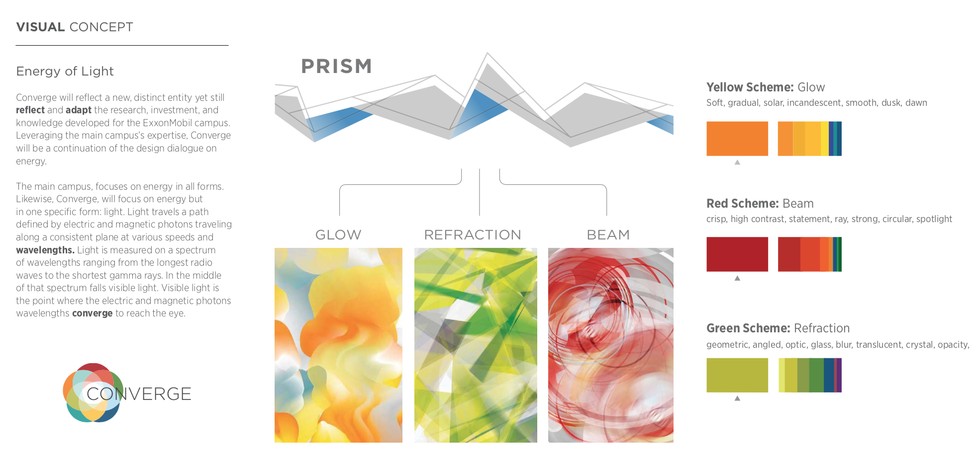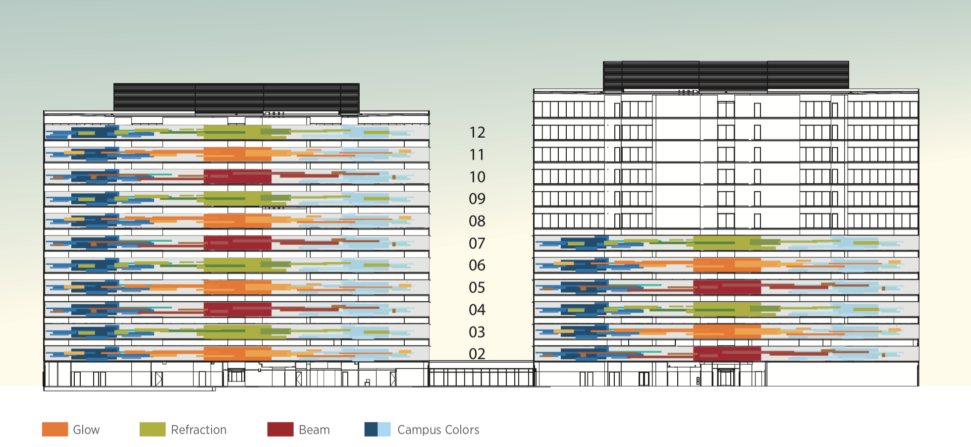 PRISM was the overall project concept and guiding design principle. Each of the 17 floors had a different design that fell into one of three different themes Glow (orange), Beam (red), and Refraction (green).